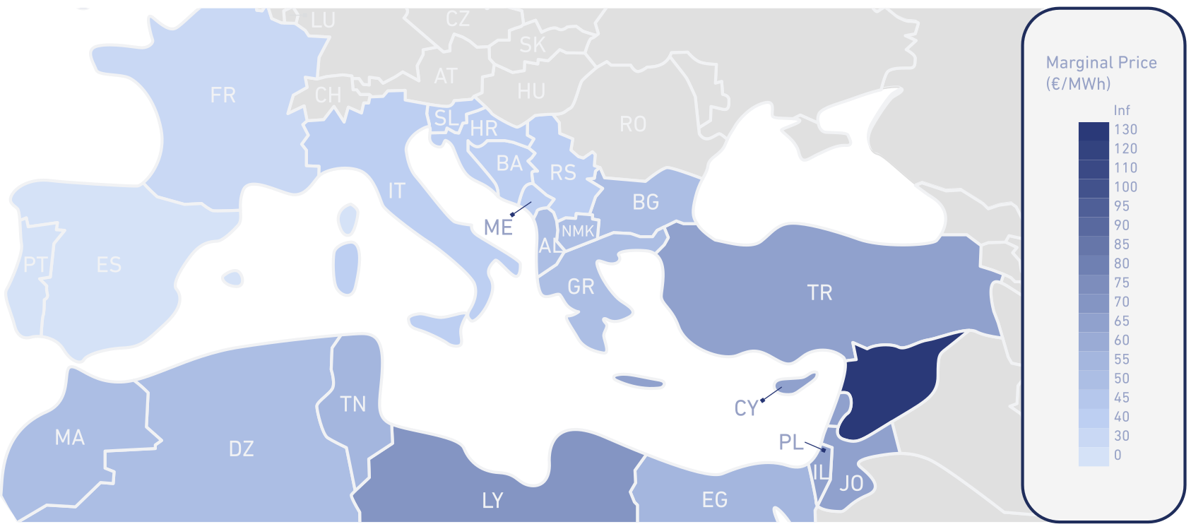 On the map above, each country or bidding zone is coloured according to its annual average marginal electricity production cost, expressed in €/kWh. Spain, Portugal and France show the lowest average marginal prices among Mediterranean countries, thanks to their abundant decarbonised generation mix, including nuclear, hydroelectric, wind and solar power. This cost advantage results in predominantly export-oriented electricity flows towards northern Italy on one side, and the western Maghreb — particularly Morocco and Algeria — on the other.