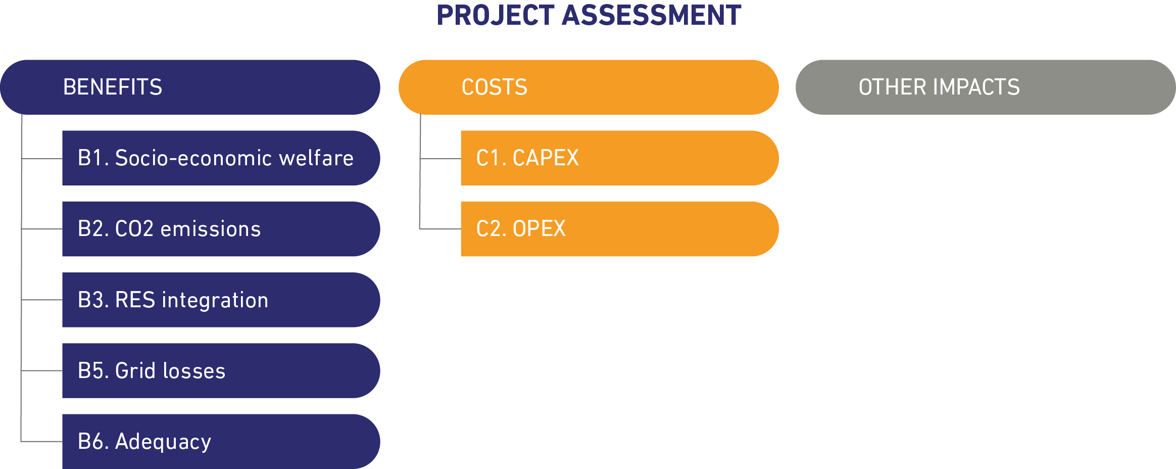 B1. Socio-economic welfare (SEW) or market integration reflects a project’s ability to reduce congestion between bidding zones, thereby increasing transmission capacity and facilitating more efficient electricity trading across markets. SEW quantifies the annual cost savings achieved by the system due to the project, including fuel cost savings, monetised savings in the CO₂ emissions, and variations in the Expected Energy Not Supplied (EENS). It is important to note, however, that SEW does not account for changes in grid losses, which are evaluated separately through a different indicator.